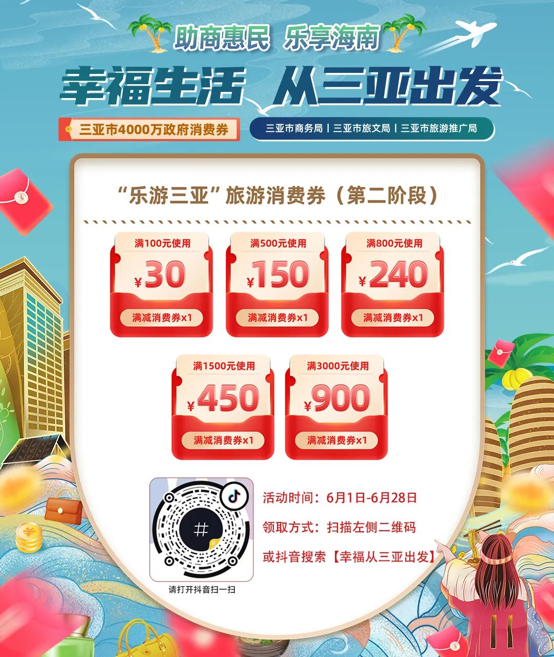 此外,“樂游三亞”旅游消費券第二階段活動在抖音平臺上線,活動時間為6月1日至6月28日,消費券包括滿100元減30元、滿500元減150元、滿800元減240元、滿1500元減450元、滿3000元減900元等,消費券有效期以平臺券面展示信息為準,全國游客與三亞市民均可使用。