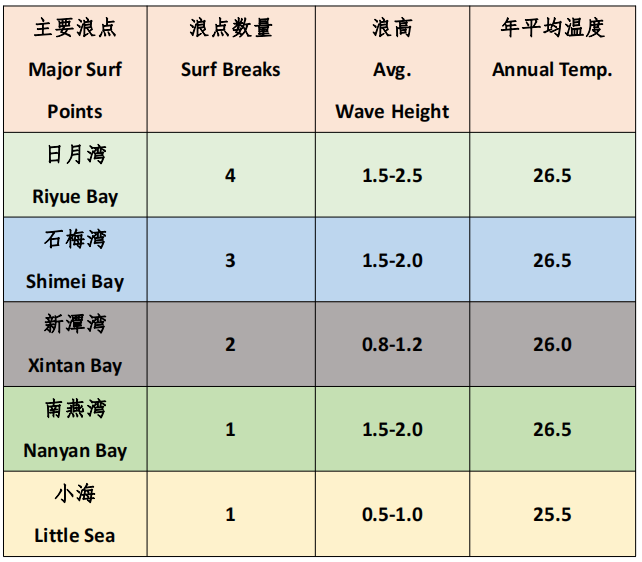 與世界知名沖浪勝地夏威夷同緯度的萬寧日月灣是世界上少有的擁有高質量定點浪型和沙灘浪型的海域之一,海浪綿長有力、起伏頻率高,年平均溫度26.5℃,年平均浪高1.5米至2米,全年都適宜沖浪,平均2米的大浪是從10月到次年3月,長達半年。