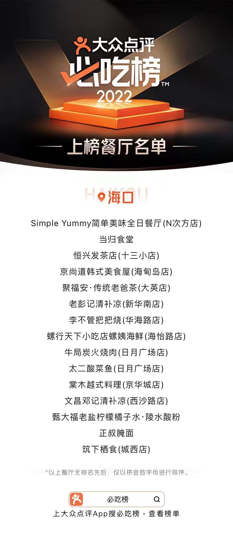新海南客戶端、南海網、南國都市報6月22日消息(記者 任桐 實習生 姚詩瑞)6月22日,大眾點評正式發布2022年“必吃榜”,全國57城1482家優質餐廳脫穎而出。其中,海南共有25家餐廳上榜,海口15家,三亞10家。據悉,大眾點評“必吃榜”已經是第六年發布。
