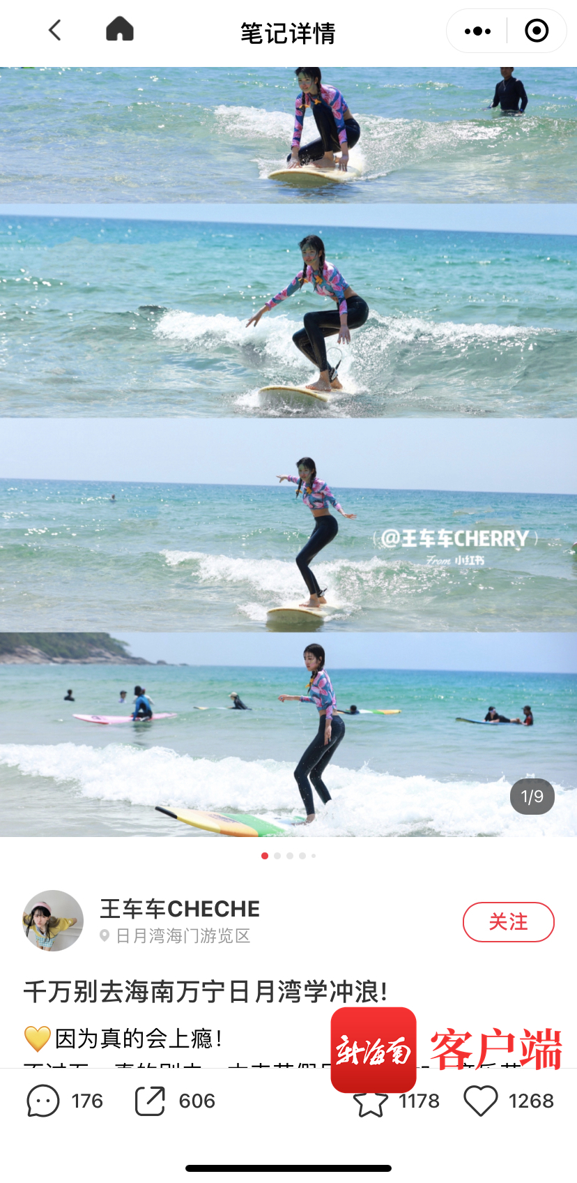 “千萬別去海南萬寧日月灣學沖浪,因為真的會上癮!”在國內某知名社交分享平臺上,“王車車”秀出自己在萬寧沖浪的大片以及游玩攻略,獲得上千的收藏和點贊。劃水、越浪、轉板、抓浪……在萬寧日月灣海岸線上,像“王車車”一樣與海搏擊、乘風破浪的人并不在少數,岸邊是各類沖浪店、民宿旅館、咖啡餐飲,讓人目不暇接,大多數店鋪門前都掛著沖浪教學、沖浪項目的價目宣傳。