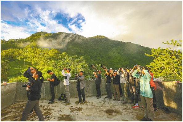 ↑在海南鸚哥嶺國家級自然保護區,參加研學旅行的學生一起觀察鳥類活動。海南日報記者 袁琛 攝
