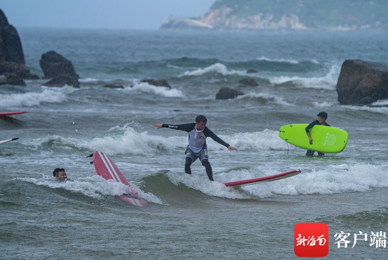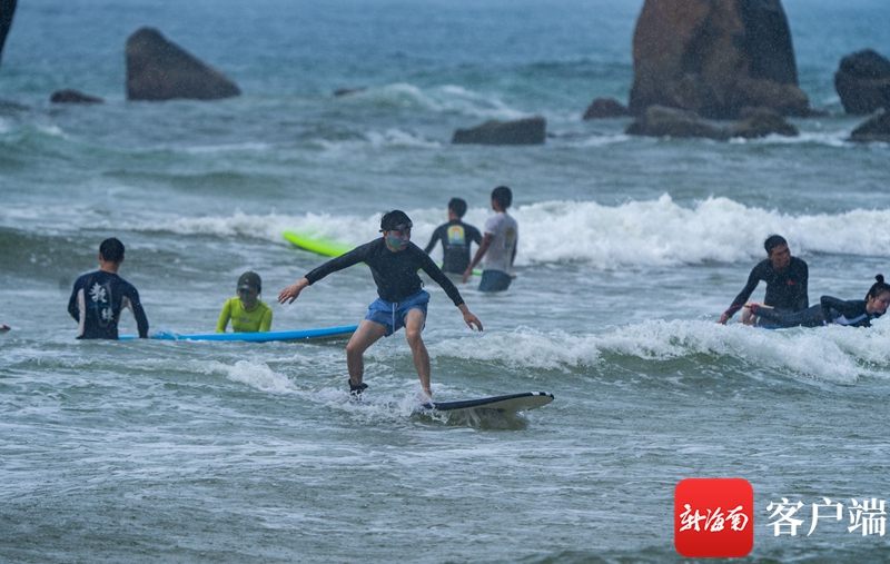 新海南客戶端、南海網(wǎng)、南國都市報7月13日訊(記者 劉孫謀)13日上午,在萬寧市石梅灣海域,天空降起暴雨,但是在海面上,依然有許多沖浪愛好者在海中沖浪玩耍。沙灘上,一些沖浪俱樂部帶著前來沖浪的愛好者們在進行熱身運動,學(xué)習(xí)沖浪技巧后,在教練的陪伴下,愛好者們跟著教練進入沖浪海域進行體驗,雖然天空中飄著雨,但是無法阻擋沖浪愛好者的激情。