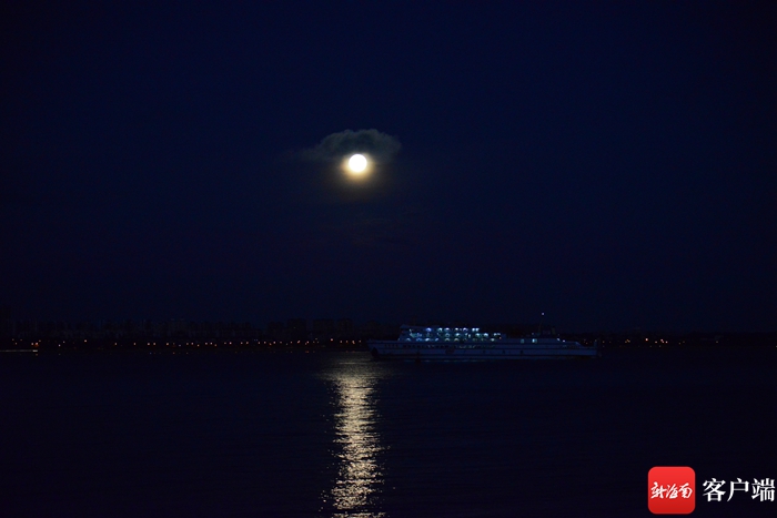 14日清晨,海口天空的超級月亮,一艘渡輪正在海上航行。記者 陳衛東 攝