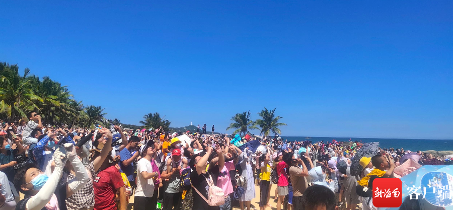 發射前,龍樓鎮希爾頓酒店附近的淇水灣人山人海, 沙灘扎著一排排的帳篷,一些游客在帳篷內休息。更多游客選擇在沙灘上,吹著海風散步。文昌市科普中心、銅鼓嶺、石頭公園也是有數不清的市民游客聚集,都在等待火箭發射的那一刻。