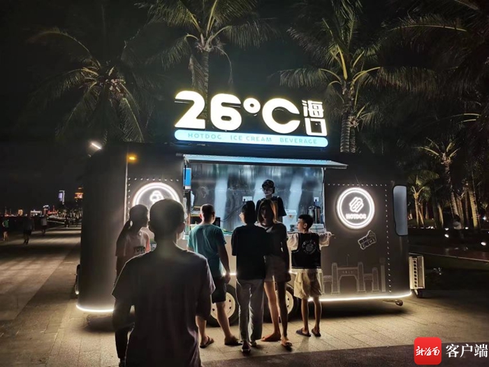 7月26日,消博會現場熙熙攘攘,一條馬路之隔的西海岸貫通更新工程的沿線海灘風景如畫,游客市民絡繹不絕,海邊擺放了10輛移動餐車,人們悠閑地購買甜點小食,十分愜意。