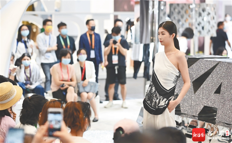 7月27日下午,在消博會2號館卡爾拉格斐展位舉行的新品預覽會活動,吸引眾多觀眾駐足圍觀。多個走秀模特的時裝表演,也讓2號館的時尚度更上一個臺階。