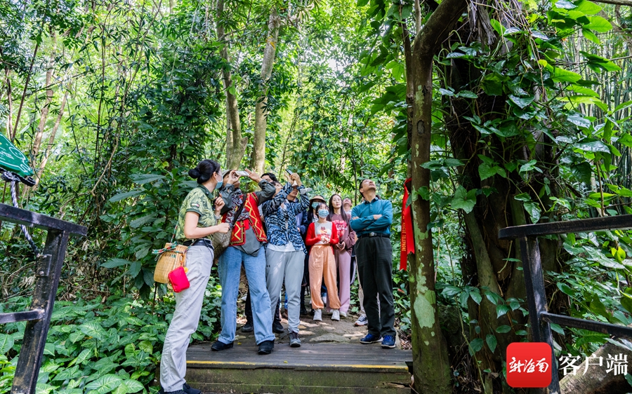 10月30日,“走進黎族”文化名家采風團走進位于保亭的呀諾達熱帶雨林文化旅游區(qū),在黎家阿妹的帶領下,近距離觀察雨林生靈,與自然對話。記者 李昊 攝