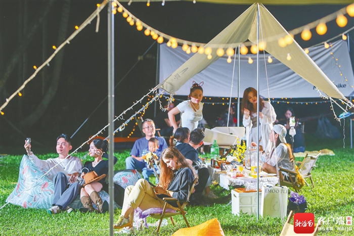 星空為幕,大地為營(yíng)。10月29日傍晚,在呀諾達(dá)雨林文化旅游區(qū)的寬闊草坪上,紅火露營(yíng)活動(dòng)拉開(kāi)帷幕。現(xiàn)場(chǎng)分為露營(yíng)區(qū)、電影區(qū)和天幕區(qū)。親子、情侶、車友結(jié)伴出行,許多露營(yíng)愛(ài)好者們共聚于此,共同享受愜意的時(shí)光。星空電音派對(duì)、星空電影院、自助燒烤、“DIY”紅毛丹特飲、“盲盒”禮物交換……當(dāng)晚的潮玩活動(dòng)內(nèi)容豐富多彩,涵蓋了律動(dòng)健康、親子互動(dòng)、美食分享等多個(gè)方面。
