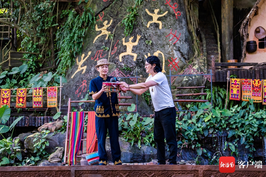 10月31日,在海南檳榔谷黎苗文化旅游區表演舞臺上,演員與散文家胡竹峰(右)互動。記者 李昊 攝