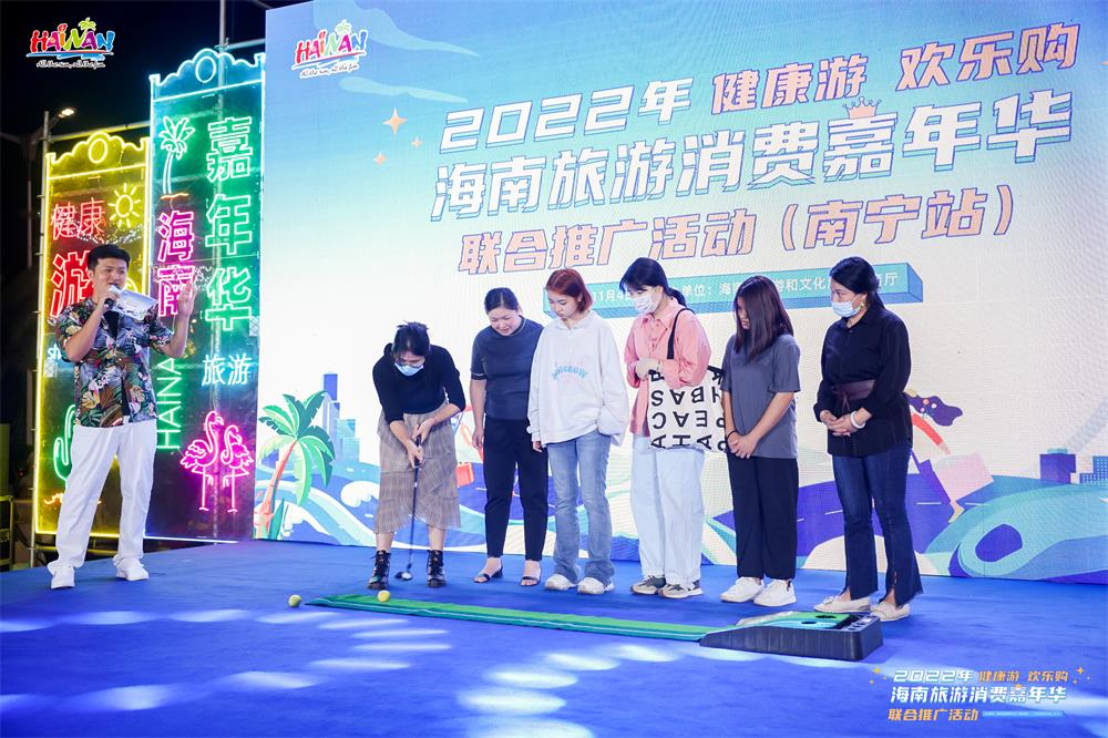 趣味游戲互動帶領現場觀眾體驗揮桿高爾夫的樂趣。海南省旅文廳供圖