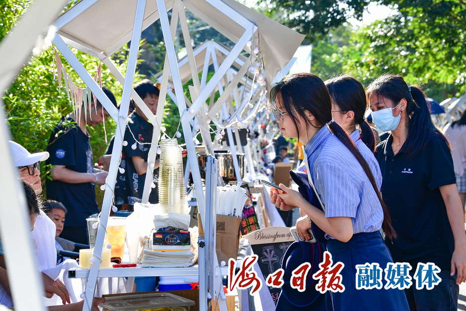 龍華區龍橋鎮昌學村,特色國潮集市攤位前吸引了眾多游客駐足。海口日報融媒體見習記者 楊鶴 攝