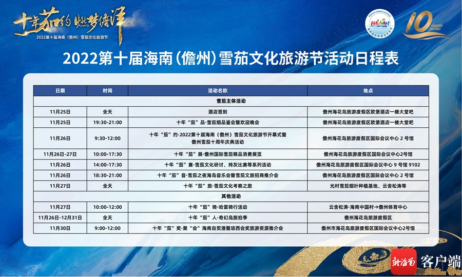 新海南客戶端、南海網、南國都市報11月17日消息(記者 梁振文) 2022年(第二十三屆)海南國際旅游島歡樂節即將歡樂來襲,作為本屆歡樂節系列活動之一的2022第十屆海南(儋州)雪茄文化旅游節,同時也是歡樂節儋州分會場的重點活動。活動將于2022年11月25日至30日在儋州海花島旅游度假區隆重舉行,其中主體活動將在11月26日舉行。十年風雨,筑夢遠航,從2013年至今,儋州雪茄文化旅游節已經走過十年歷程。本屆活動以“十年茄約、燃夢儋洋”為主題,儋州雪茄文化為主線,融入精品展銷、機車騎行、浪漫旅拍、招商推介、旅游美食等元素,打造雪茄節十周年十大“雪茄+”特色主題活動,誠邀廣大朋友前來共享儋州雪茄文化旅游盛宴。