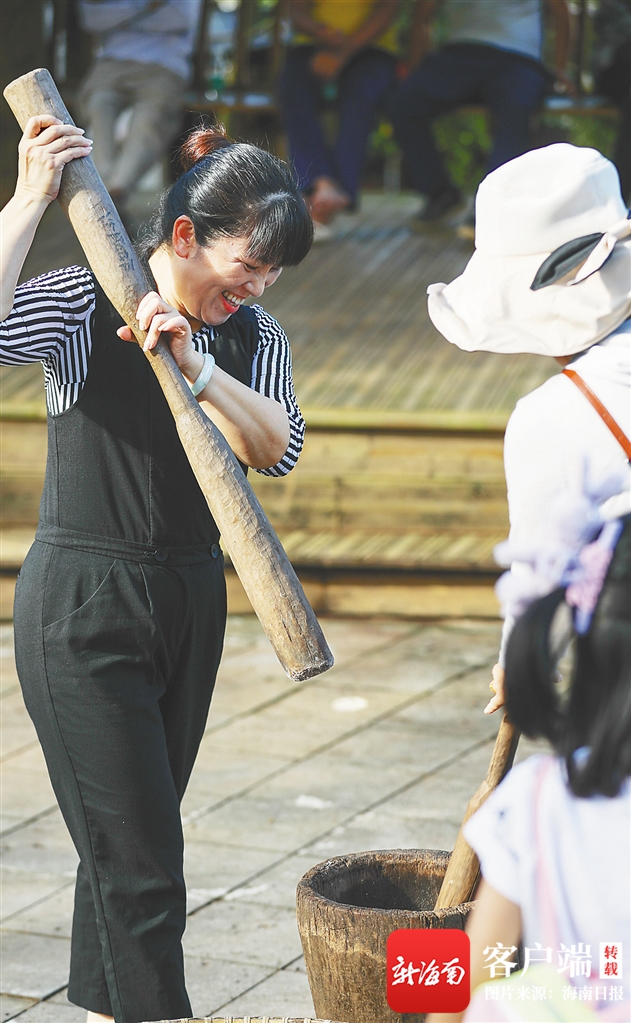 11月27日,在白沙擁處村,游客體驗舂米勞動。海南日報記者 李天平 攝