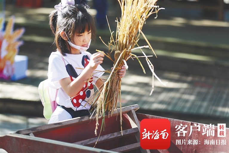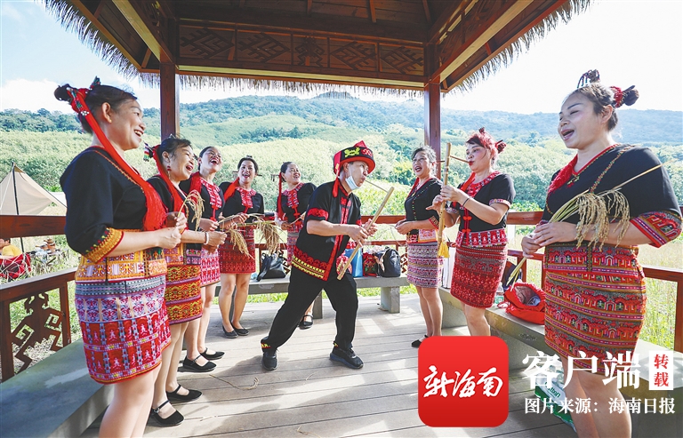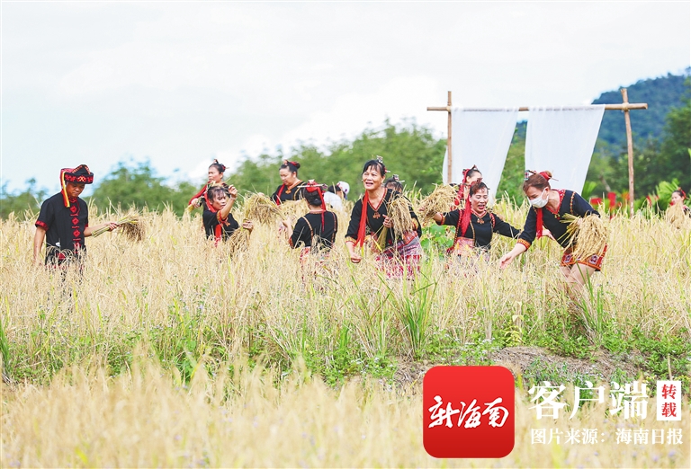 以山蘭稻田為舞臺,以綠水青山為幕布,身穿節日盛裝的黎族兒女穿梭在稻田間,手拉手歡唱《捻稻歌》等,歡快的歌聲飄揚在群山之間,古老而又淳樸的農耕畫面展現于眾人眼前,也預示著人與大自然和諧相處、互相依存、共同發展的美好明天。在這一獨具民族特色的豐收慶典里,遠道而來的賓朋還饒有興致地體驗收割、舂米等黎族傳統稻作農事。