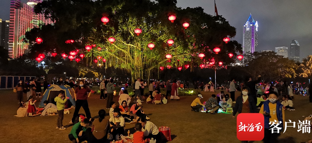 五彩斑斕,人潮涌動,是元宵夜的萬綠園給人的第一印象。當你走進萬綠園騰飛廣場附近那片寬廣的綠地,站在人潮中看向濱海大道方向,你會發現這樣的景象:眼前,許許多多的人們或走動或三五成群席地而坐,又或者搭了個露營小帳篷聊天吃零食喝飲料,一派熱鬧;遠一點,掛滿了紅彤彤燈籠的大樹隨風小幅波動,添了一種歡喜的氣氛;再遠一些,就是成群的高樓建筑正在上演著賞心悅目的燈光表演。一切似乎都在動起來,熱鬧似乎是停不下的流動的波浪。
