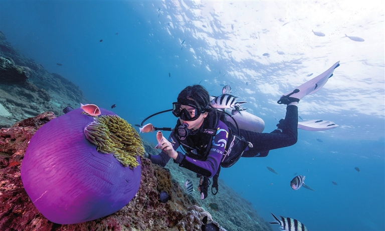 ?游客在蜈支洲島海域體驗海底漫步,與魚兒親密接觸。