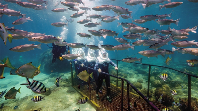 “海洋牧場與休閑漁業的結合,使漁業資源、環境資源和旅游資源得以優化配置和合理利用,實現了一二三產的相互結合和轉移,實現了景區生態效益與經濟效益雙豐收。”海南蜈支洲旅游開發股份有限公司相關負責人表示,作為三亞市首批休閑漁業試點單位,接下來,在海南大學/南海海洋資源利用國家重點實驗室海洋牧場團隊技術支持下,蜈支洲島將積極完善“投放生態礁、放流戀礁魚、整治海岸線、推進智能化、提升服務能力”五配套等方面,著力推進“漁旅”高質量融合發展,為海南旅游經濟發展增添藍色底蘊。