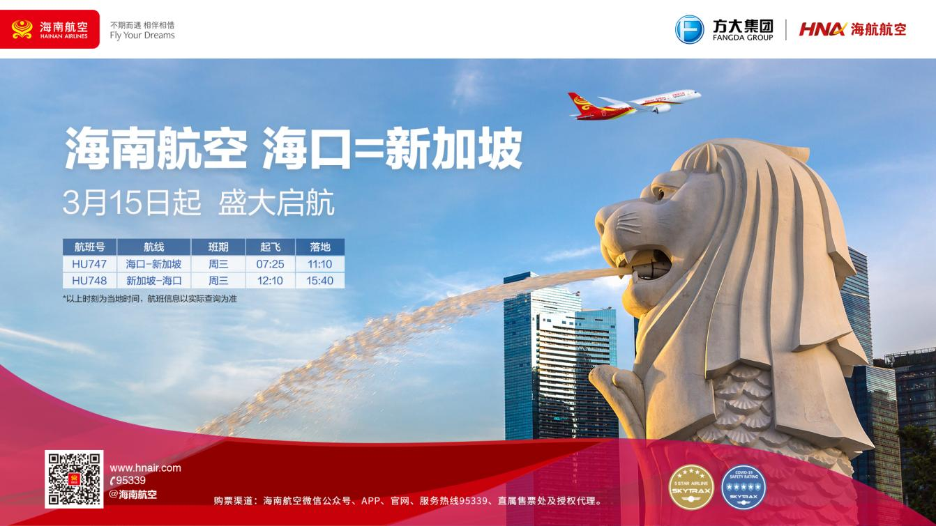 新海南客戶端、南海網、南國都市報3月1日消息(記者 丁文文 通訊員 楊映娟)3月1日,記者從海南航空獲悉,為滿足廣大旅客出行需求,海南航空計劃于3月15日起恢復海口?新加坡直飛國際航線。該航線的通航運營,將為兩地搭建起經貿、旅游和文化交流的橋梁。