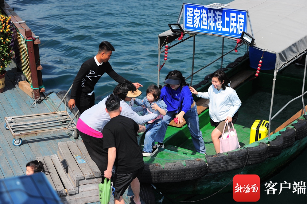 3月14日,游客乘船抵達海南首家海上共享漁莊。記者沙曉峰攝