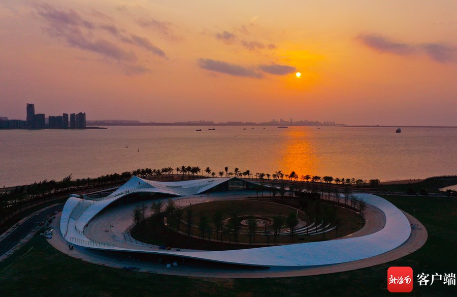 海口灣演藝中心旁邊,海口演藝新空間(二期)項目正如火如荼地建設,頗具藝術氣息的建筑主體與??跒逞菟囍行南嗷ズ魬?,遠處海天相接,風光無限。