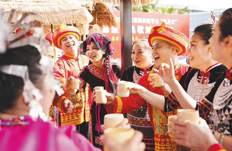 近日,在樂東等地,當?shù)厝罕娕e杯歡慶“三月三”。 新華社記者 樊雨晴 攝