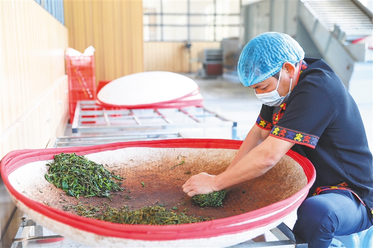 五指山市水滿鄉的一位茶農在展示手工制茶。