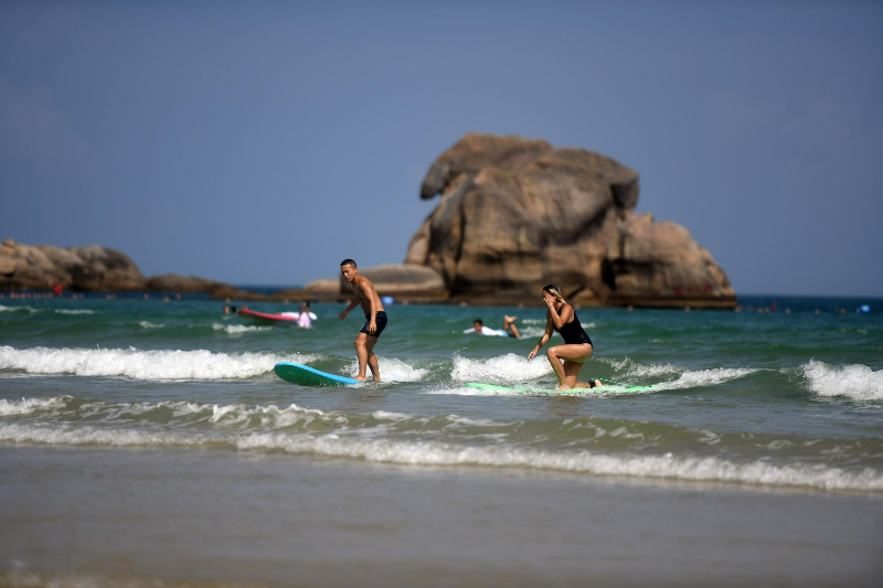 資料圖:游客在三亞后海沖浪。記者 沙曉峰 攝