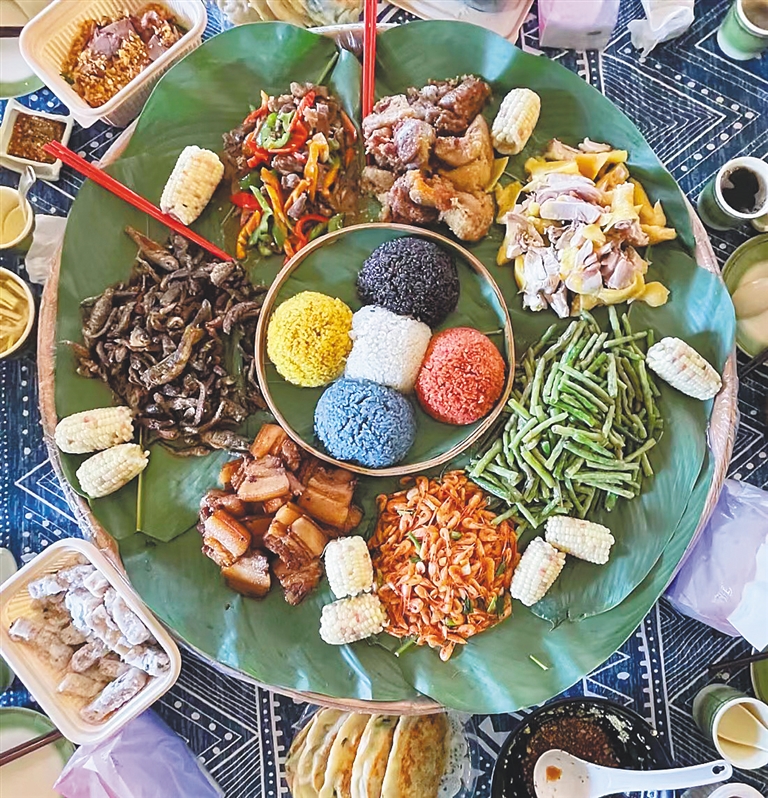 苗家簸箕餐,包含了香煎五腳豬肉、五色飯、苗家船型粽等美食。海南日報(bào)記者 謝凱 攝