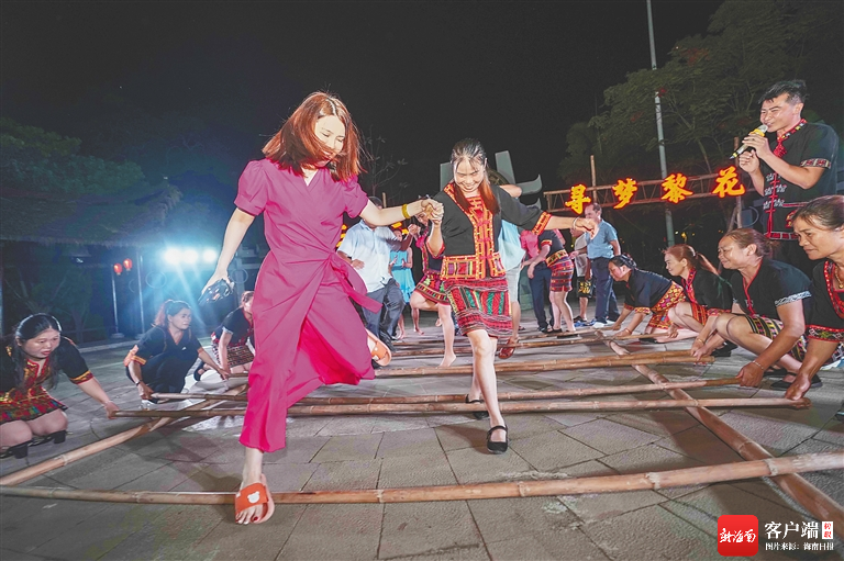 5月1日晚,在昌江黎族自治縣王下鄉浪論村,游客和村民們跳竹竿舞,體驗黎鄉風情。海南日報記者 陳元才 攝