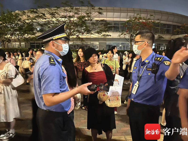 “您好,寄存行李往里面走,填寫好卡片,我們志愿者會幫你們保管好,祝你們玩得開心?!薄皝?,姑娘們,喝點水”。為了此次演唱會順利進行,??谑懈飨嚓P職能部門全力保障,化身“服務員”,為歌迷們保駕護航。