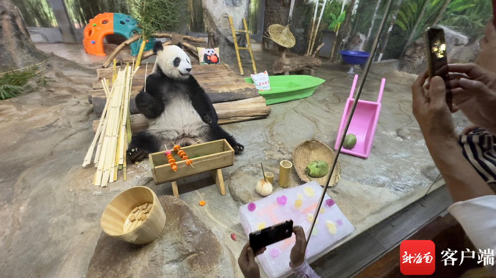 大熊貓貢貢在空調(diào)房里“擼串”。海南熱帶野生動(dòng)植物園供圖