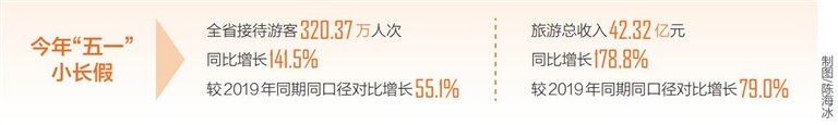 在業(yè)內(nèi),“五一”檔一直被看作全年旅游市場(chǎng)的“期中考”,是行業(yè)的重要節(jié)點(diǎn),也是全年旅游行情的風(fēng)向標(biāo)。今年的這場(chǎng)“期中考”,海南取得了近十年來的最好成績(jī)——全省接待游客320.37萬人次,同比增長(zhǎng)141.5%,較2019年同期同口徑(下同)對(duì)比增長(zhǎng)55.1%;旅游總收入42.32億元,同比增長(zhǎng)178.8%,較2019年增長(zhǎng)79.0%。