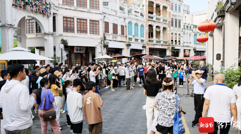 ?游客打卡海口騎樓老街。海口市旅文局供圖