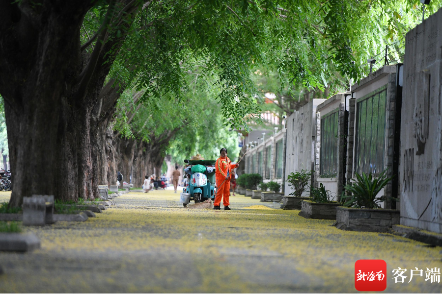 5月,海南三亞,環衛工人在清掃飄落地面的紫檀花。記者 沙曉峰 攝