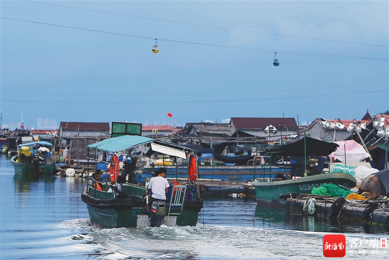 波光粼粼的海面上,木板搭起縱橫交錯的網格,格子上的鐵皮木屋一戶連著一戶,船只穿梭其間。俯瞰陵水黎族自治縣的新村鎮新村港,400多戶漁排星羅棋布,形成一道壯觀又獨特的風景。