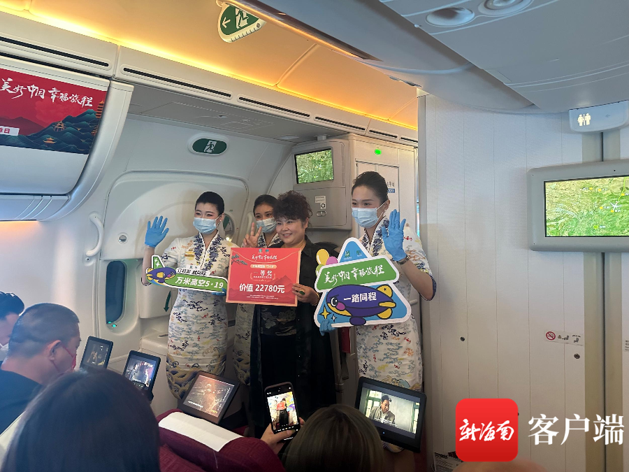 首航航班上舉辦了“萬米高空的5·19”主題航班活動,客艙內部采用“中國旅游日”主題元素進行裝飾,烘托出濃厚的活動氛圍。海南航空還聯合文化和旅游部以及其他合作方,為乘坐首航航班的旅客準備了趣味互動環節以及精美禮品。