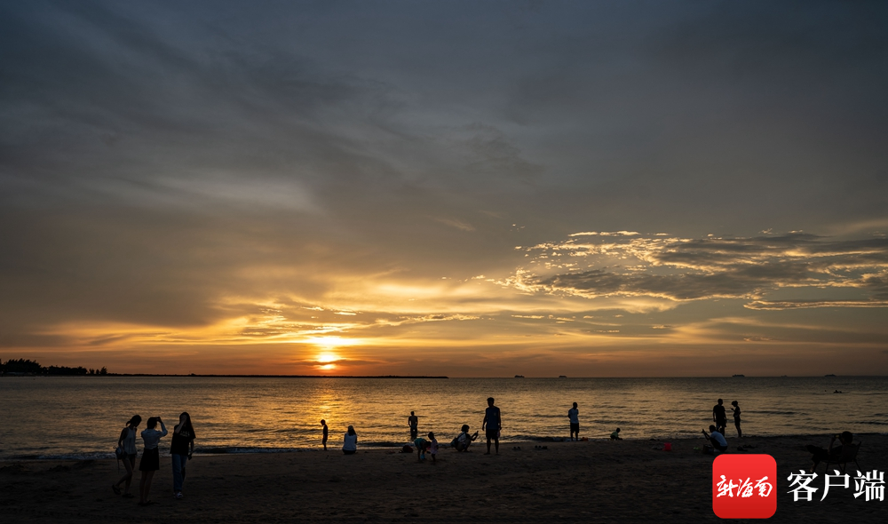 新海南客戶端、南海網、南國都市報5月26日消息(記者 劉孫謀)5月26日下午6時,在??谑袟0堵稜I基地,一場降雨過后,??诔霈F美麗的晚霞,金色的陽光灑在沙灘上,吸引了許多市民前來游玩拍照,有不少市民在沙灘上戲水,還有市民在此一邊喝椰子水一邊打邊爐,美景美食相伴,好生愜意。