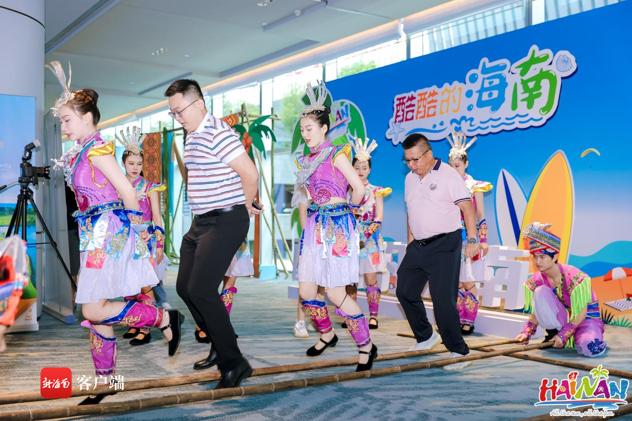臺(tái)上,推介官們?cè)诂F(xiàn)場(chǎng)“安利”,嘉賓們對(duì)海南心馳神往;臺(tái)下,海南非遺展區(qū)、主題美食打卡點(diǎn),讓嘉賓們近距離感受海南文化和風(fēng)情。翻轉(zhuǎn)、編織、打結(jié)……黎族手藝人將一縷縷藤葉,快速編織成籮筐、衣簍等用品,獨(dú)特的技藝令人們贊嘆不已。嘉賓們一邊品嘗著椰子糕、斑斕粽、清補(bǔ)涼等獨(dú)具特色的海南美食,一邊觀賞韻味十足的黎族舞蹈,沉浸式體驗(yàn)“海南之旅”。
