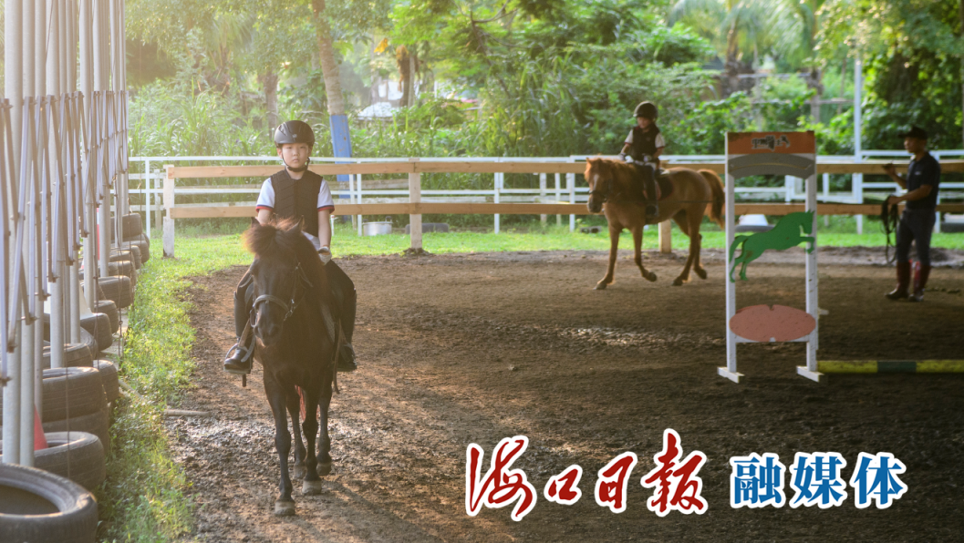 咖啡莊園旁的“懂宿”馬術主題民宿里,馬場上兩名穿戴馬術裝備的少年正在教練的帶領下體驗騎乘。