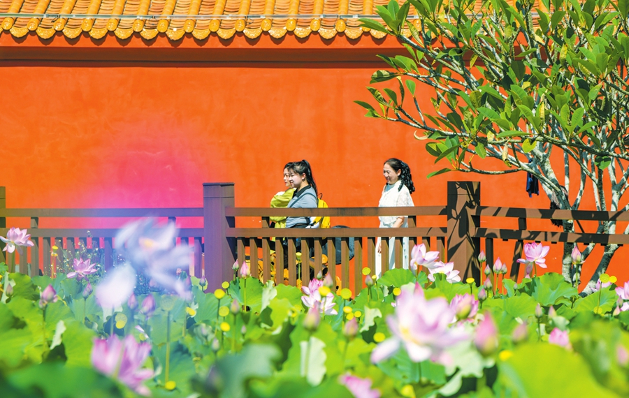 市民游客在美蘭區芳園國際藝術村棧道賞荷。??谌請笕诿襟w記者 康登淋 攝